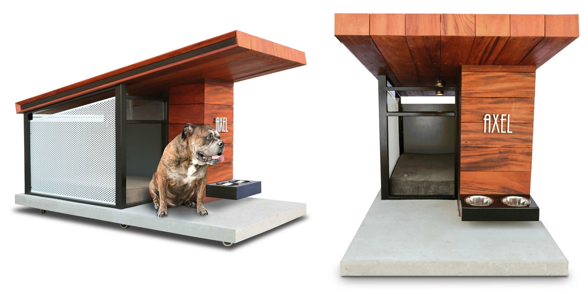 Detalle minimalista en el techo y ventanas en policarbonato irrompible cuidando la integridad de tu marcota. terraza en parte frontal con bases para platos de alimento y agua.